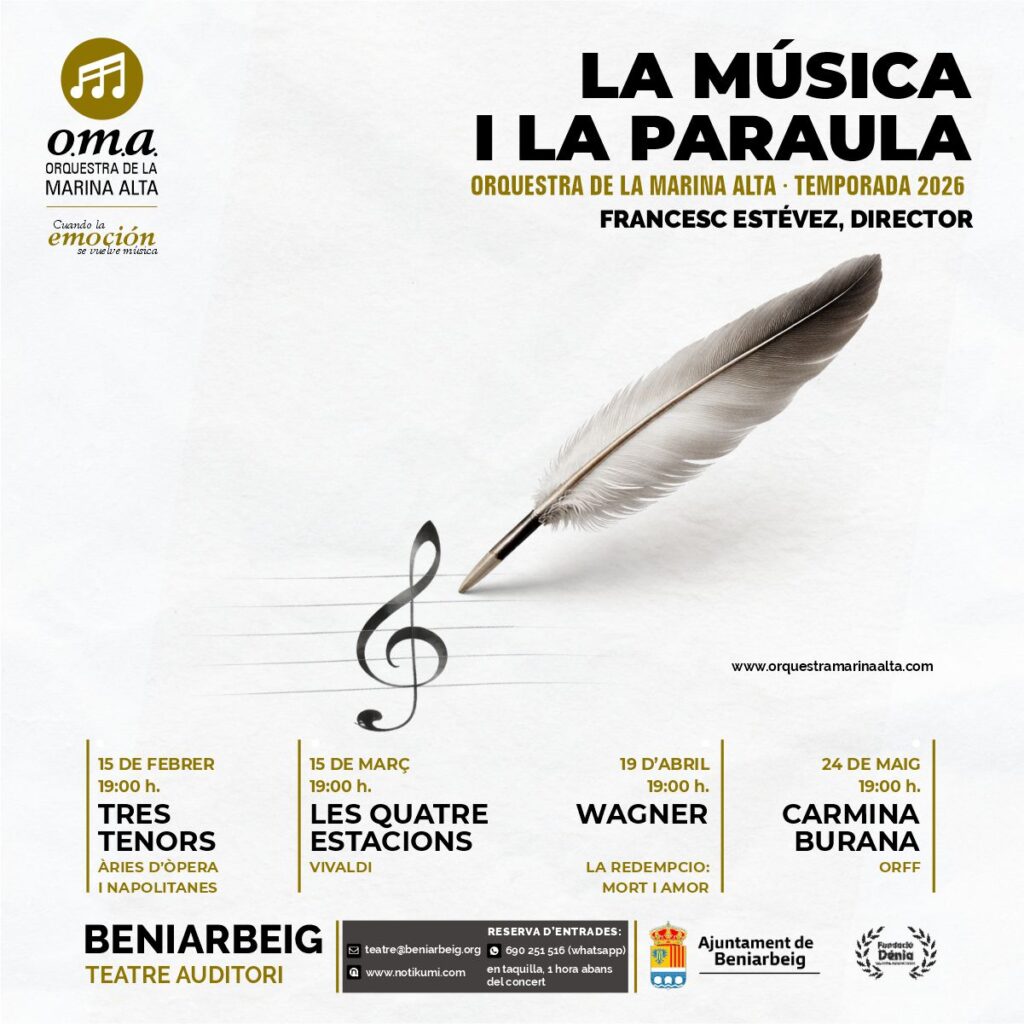 L’Orquestra de la Marina Alta (OMA) presenta la seua temporada 2026, titulada La música i la paraula, un cicle de quatre concerts que explora la relació entre la música i els textos que l’han inspirada al llarg de la història. La temporada tindrà lloc al Teatre Auditori de Beniarbeig, amb la col·laboració de l’Ajuntament de Beniarbeig i la Fundació Dénia.
