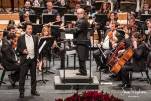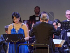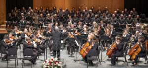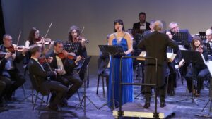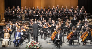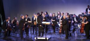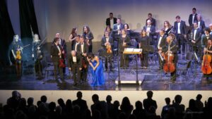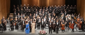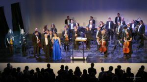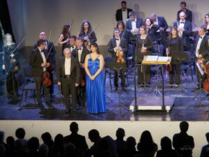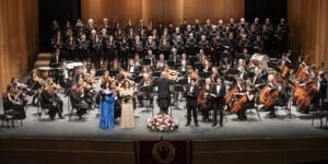 Momento del concierto de la Orquesta de la Marina Alta con el Orfeón Crevillentino interpretando la Sinfonía nº 2 de Gustav Mahler en el Auditorio de Teulada Moraira el 17 de febrero de 2024 bajo la dirección de Francesc Estévez, Mar Morán como soprano y Cristina del Barrio como mezzosoprano.